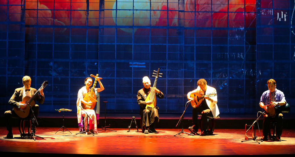 ·方锦龙(中)与荷西·路易斯·莫利亚斯(左一)、长须与佳(左二)、纳瑟尔·沙玛(右二)、伊卜拉伊木·巴拉提合奏《库车丝路行》。(库车市融媒体中心 蔡蔬 / 摄)