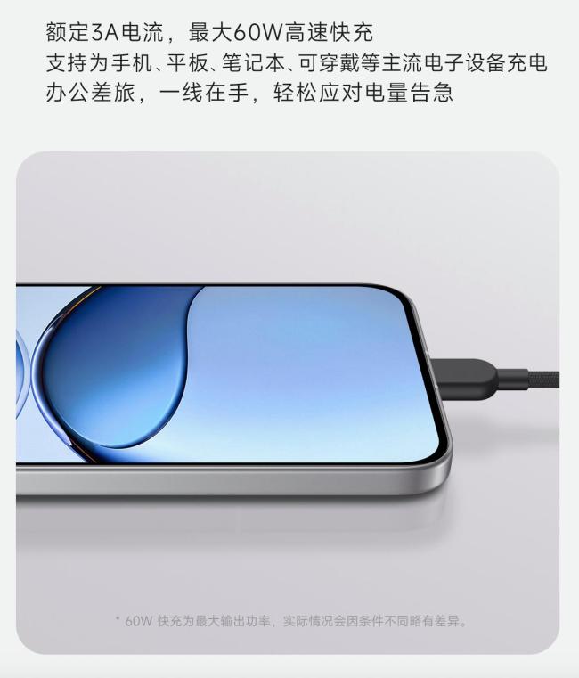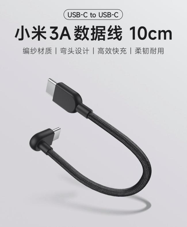 小米推出了一款10厘米长的3A数据线(USB-C充电线),适用于手机给其他设备进行反向快充,售价9.9元。这款数据线采用编纱材质,一端设计为90度弯头,额定电流3A,最高支持60W快速充电,能够为手机、平板、笔记本和耳机等多种电子产品充电。
