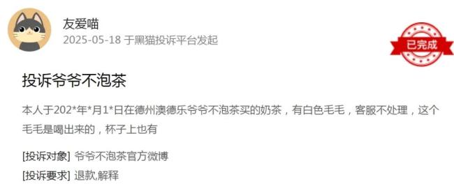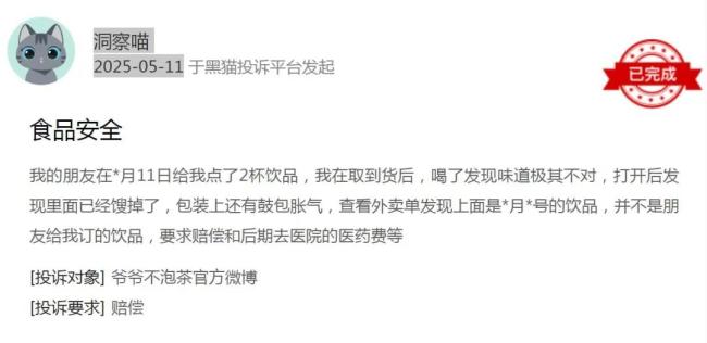 黑猫投诉平台数据显示,2025年1-5月,针对爷爷不泡茶的投诉量同比增长200%,涉及“饮品中出现苍蝇”“喝出塑料异物”“糖度误差超标”等问题。例如,5月2日有消费者在贵州铜仁门店购买的“水蜜桃奶茶”中喝出异物,店家仅退款本金,拒绝按《食品安全法》赔偿;5月9日,湖北咸宁门店被曝“荔枝冰酿中喝出苍蝇”,引发舆论哗然。