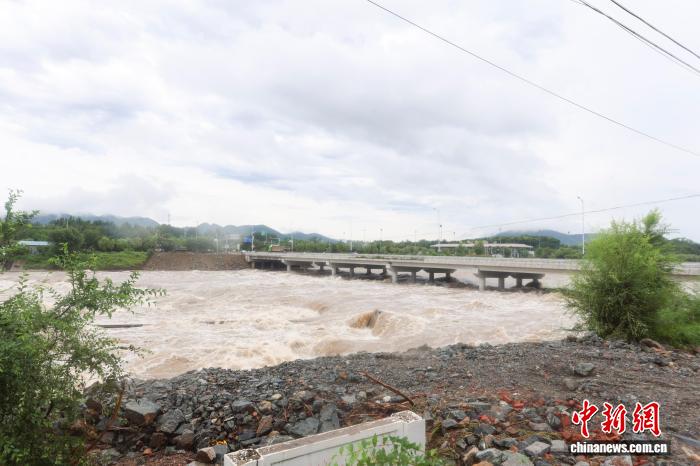 7月29日,受强降雨影响,北京市密云区潮河水位上涨,水势汹涌。中新社记者 贾天勇 摄