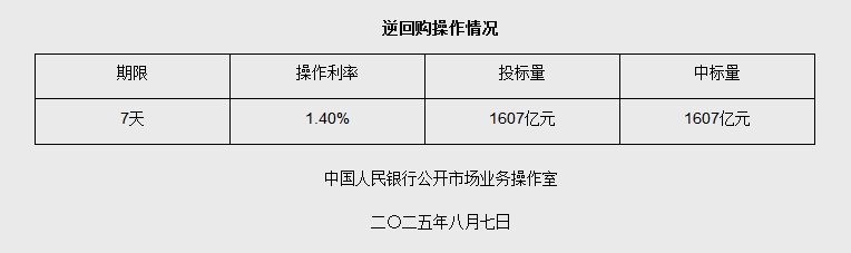 中新网8月7日电 据央行网站消息,2025年8月7日中国人民银行以固定利率、数量招标方式开展了1607亿元逆回购操作。具体情况如下: