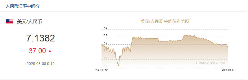 8月8日人民币对美元中间价报7.1382元 下调37个基点