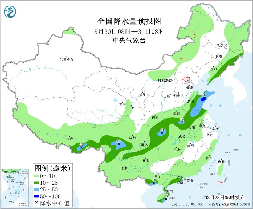 8月30日08时至31日08时,吉林东部、辽宁东部、西藏东南部、黄淮东部和西南部、江淮北部、江汉西部和北部、四川南部、重庆中东部、云南西北部、广西西南部、广东西南部沿海等地部分地区有中到大雨,其中,山东东部等地局地有暴雨(50~70毫米)。内蒙古中东部等地部分地区有4~5级风。北部湾将有5~7级风,阵风8级。
