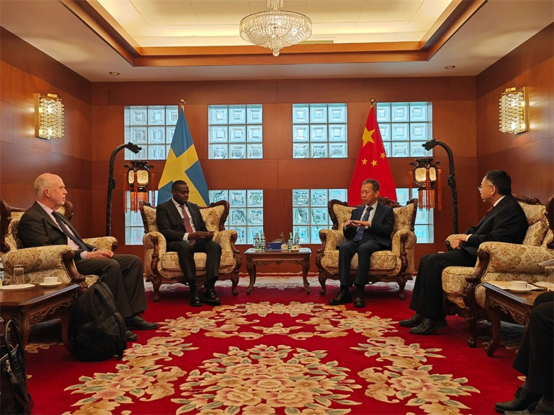 中国驻瑞典大使崔爱民会见国际水伙伴关系组织首席执行官西马拉布维。中国驻瑞典大使馆供图