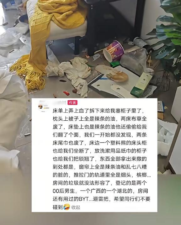 2名00后男孩开房住宿 坐断床头柜 房间脏乱不堪引发热议!8月26日,广东中山发生了一起令人惊讶的事件。两名来自广西和湖北的00后男生在一家民宿住宿两天后,房间内留下了严重的污垢。地上散落着烟头和槟榔,床垫、枕头和被子上沾满了辣条的油渍,柜子的锁被撬开,床头柜也被坐断了。整个房间无处可落脚,非常脏乱。