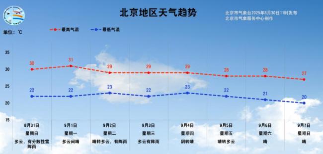 未来一周天气将以多云为主,周二夜间到周三(2-3号)会有一次阵雨天气。午间较热,早晚凉爽舒适,气温逐渐走低,一边和夏天告别,一边迎接秋天的到来。预计从8月31日至9月7日,我市最高气温在27~31℃之间,最低气温在20~23℃之间。