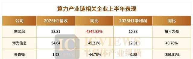 算力板块中,寒武纪成为A股最大黑马,其股价在8月28日一举超越贵州茅台,营收同比暴增43倍,云端AI芯片业务占比高达99.6%,净利润首次扭亏为盈。海光信息同样表现亮眼,上半年营收突破54亿元,同比增长45%,净利润首度迈过10亿元大关。澜科技的DDR5内存接口及配套芯片出货量猛增,高性能运力产品销售额大幅提升,公司毛利率同步增加。然而,并非所有企业都如此幸运,景嘉微因传统图形显控业务下滑,上半年出现亏损。