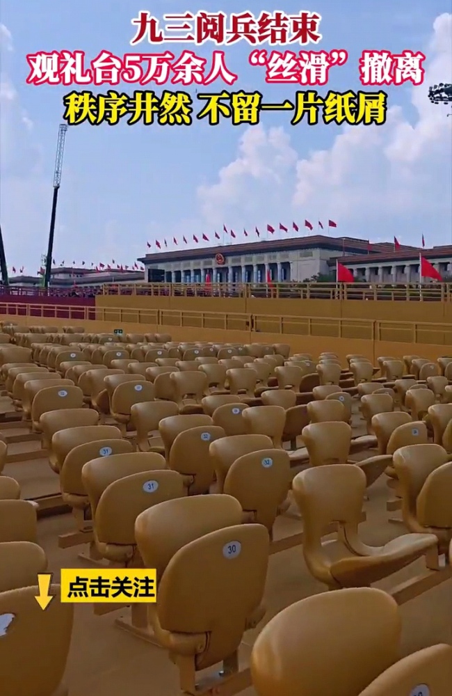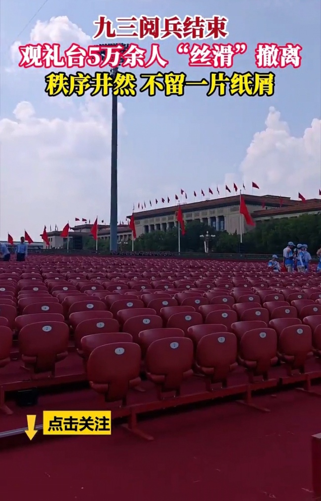 现场5万余人看完阅兵没留一片纸屑文明观礼典范。你敢相信五万多人的观礼台结束后竟然没有一片纸屑,干净的就像大家都没来过一样,这真的是太不可思议了!我相信除了我们中国人能做到之外,其他的国家应该很难再找到一个能做到的了吧!