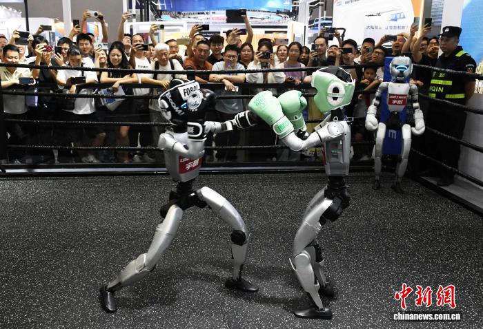 9月5日,2025世界智能产业博览会在重庆开幕。活动现场,宇树科技携人形机器人举行了一场拳击比赛,吸引民众围观。图为机器人在比赛前与观众互动。中新社记者 周毅 摄