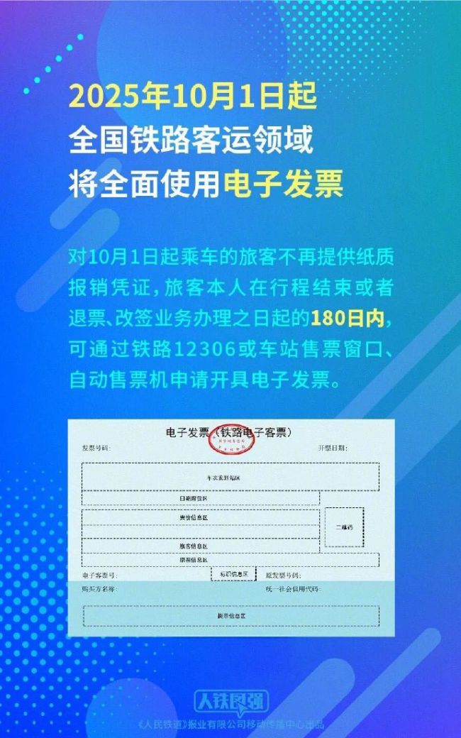 全国铁路旅客运输领域将全面使用电子发票,对10月1日起乘车的旅客,不再提供纸质报销凭证,继续提供“行程信息提示单”打印服务,同时增加线下电子发票申请渠道和购票(代办)人开具服务。