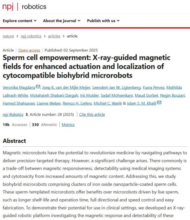 科学家将精子变可操控机器人 磁力遥控精准送药!荷兰科学家实现了一项惊人的突破,他们利用微型“精子快递员”在医生的磁力遥控下,精准穿过女性复杂的生殖系统,直达病灶并释放药物。这项研究于9月2日发表在《自然》合作期刊《npj Robotics》上。