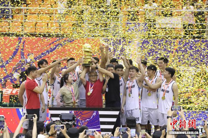 图为球员柳锐代表湘钢集团队剪下篮网。 周阳 摄