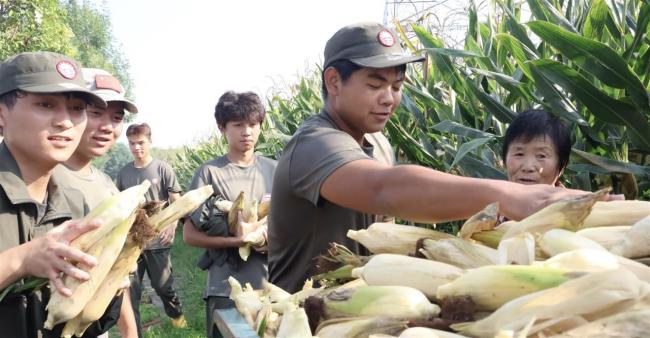9月13日上午,河南开封职业学院新生军训拉练,徒步经过一处农田时,大学生们偶遇一位正在掰玉米的大爷。30余名学生立即停下,帮大爷把玉米搬到路边,并把一车玉米剥得干干净净。