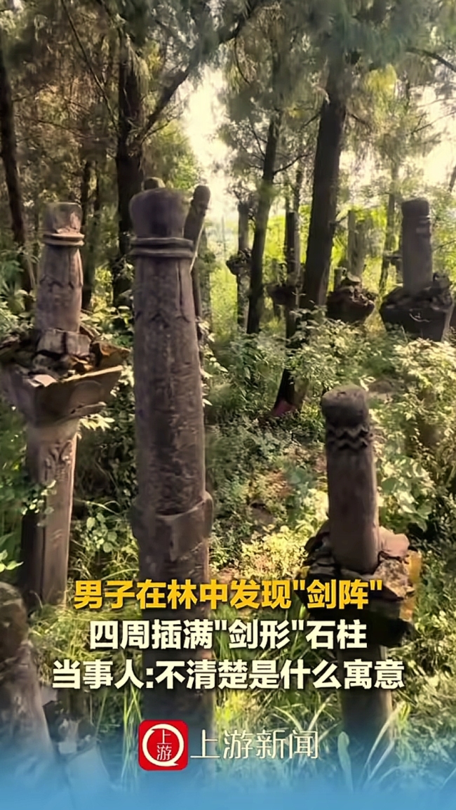 四川一男子在林中发现“剑阵”。“万万没想到!”四川资阳,男子去山上游玩,本以为是一片荒山,不料,他竟然直接愣在了原地,不是因为发现了宝贝,而是被眼前成片的“石头剑阵”吸引住了,男子傻眼了,看了半天也不愿意离开。以前看过的武侠剧和小说,男主受伤躲进荒山里,突然发现不为人知的石头阵,是不是就属于这种?有网友兴奋道:是不是剑派宗门被你发现了?起初男子以为这山上只有两座旧庙,直到往里面走眼前突然出现一片片高大的石头剑阵群,堪称鬼斧神工。男子简直不敢相信自己的眼睛,可事实就摆在眼前,他以前也来过这座山,怎么就没发现呢?视频中,这些石头剑,剑柄朝上,虽然高矮不一,但是剑尖都深埋在地下,剑身上还刻着复杂的花纹,足足有上百个,仿佛时刻在等待召唤,拔地而起。这形状显然是人为制作的,一眼看上去,年头久远,至于什么时候出现的,男子也说不清。但他觉得这次没白来,能发现这样的奇观太值了!有网友说:剑仙传承有缘人,兄弟上前挑一把摸摸看!这地方确实神奇,大家猜猜,这些石头剑到底是怎么形成的?你觉得是应该把这些老物件保护起来,还是开发旅游,拍照打卡呢?