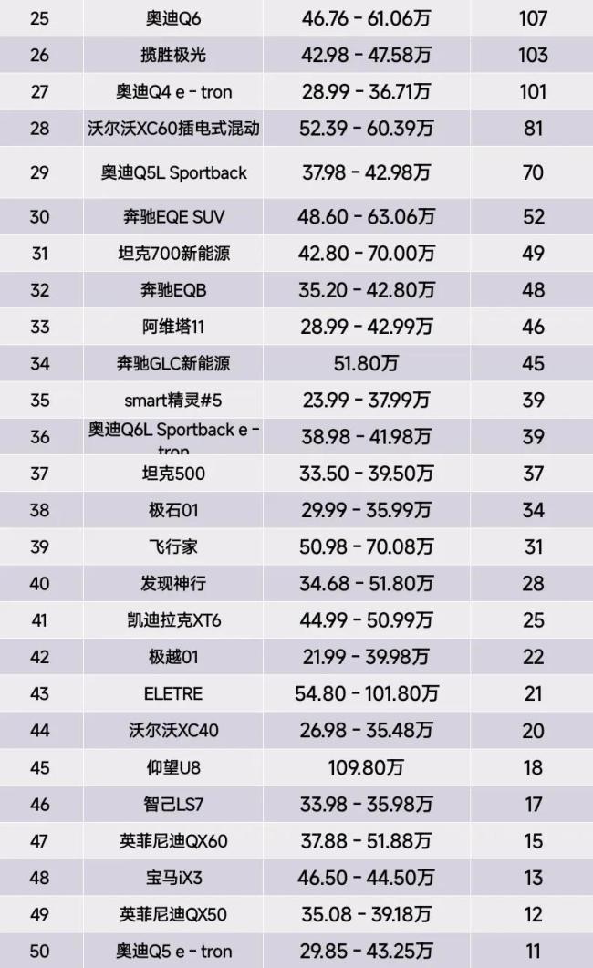 在新能源车方面,豹8以214辆的销量排在第21名。奥迪Q6L e-tron、福特烈马和奥迪Q6的销量在151到107辆之间,属于中等水平。揽胜极光、奥迪Q5L Sportback、沃尔沃XC60插电混动、坦克700新能源和奔驰GLC新能源的销量均不到52辆,表现一般。ELETRE、智己LS7、发现神行和英菲尼迪QX5的销量更是跌破50辆,市场反响较为冷淡。