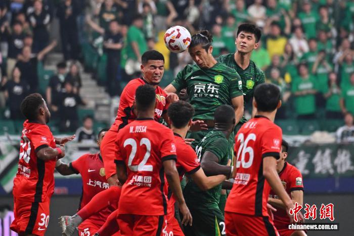 9月21日,双方球员在比赛中争顶头球。当日,在北京举行的2025赛季中超联赛第25轮比赛中,北京国安主场2:3不敌上海海港。中新社记者 赵文宇 摄