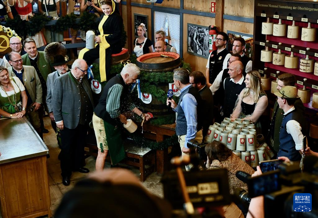 9月20日,德国慕尼黑市长迪特尔·赖特尔(中)开启本届啤酒节第一桶啤酒。新华社记者 张豪夫 摄