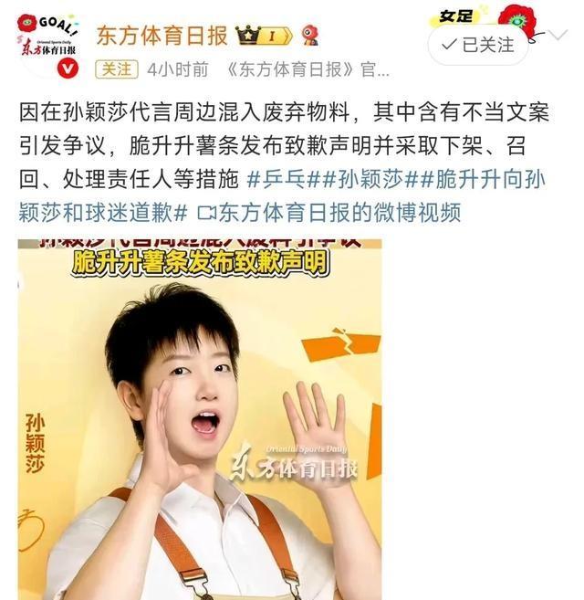 官媒批孙颖莎代言事件,网友:很失望 信任危机浮现。孙颖莎因为一包薯条陷入了舆论风波,连官媒《东方体育日报》都进行了点名,事情变得微妙起来。起因是国产薯条品牌“脆升升”邀请孙颖莎代言,但在制作周边产品时出了问题,把一些印错的废弃物料发了出去。由于涉及食品,加上代言人是孙颖莎,粉丝和大众的情绪被点燃。