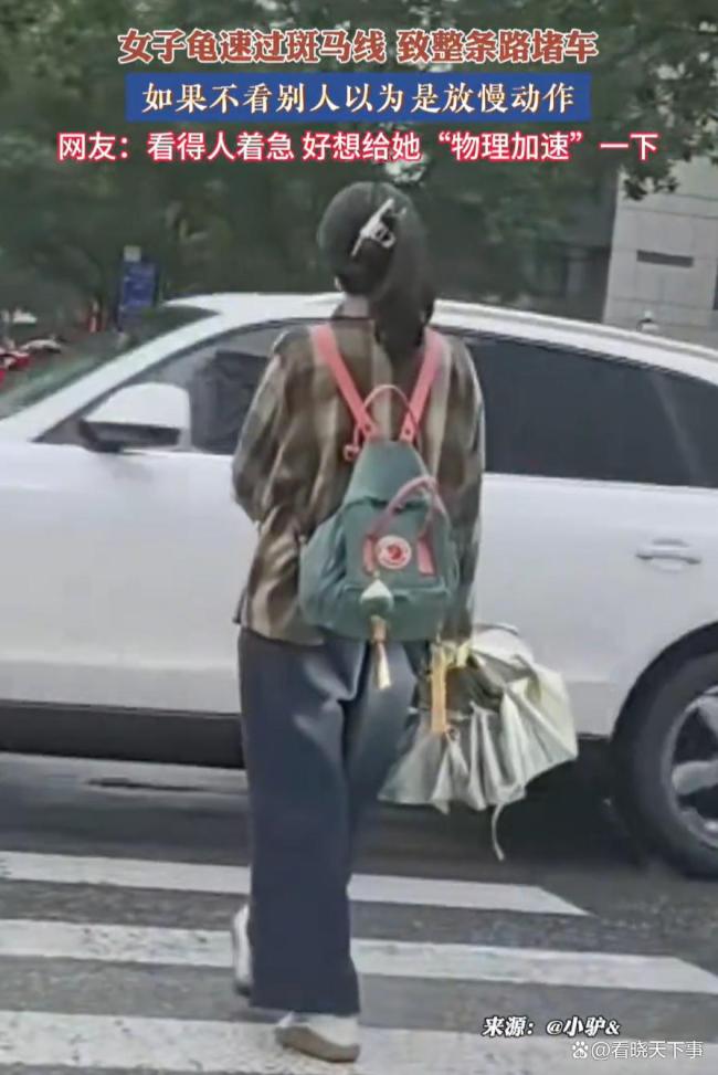 从视频里看,她戴着口罩,背着书包,手里还拿着一把伞,一步一步挪得特别缓,周围的车主估计都急得不行,但她好像完全没听见喇叭声,动作就像放了慢镜头