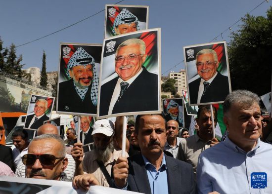 9月23日,在约旦河西岸城市纳布卢斯,民众挥舞巴勒斯坦领导人阿拉法特和阿巴斯画像参加庆祝活动。新华社发(尼达尔·艾仕塔耶摄)