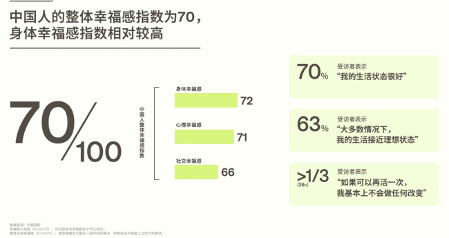 从具体维度看,身体幸福感指数最高,达72分;心理幸福感紧随其后,为71分;社交幸福感相对偏低,为66分。数据显示,70%的受访者认为“生活状态很好”,63%表示“生活接近理想状态”,超1/3的人甚至表示“若重来一次,基本不做改变”,反映出国民对当前生活的整体认可。