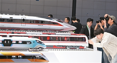 在安徽合肥举行的世界制造业大会上,中国中车展区展出的各类动车组模型吸引众多观众驻足。