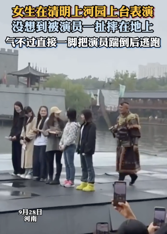 女生上台表演被演员扯摔在地上。女生在清明上河园上台表演,没想到被演员一扯摔在地上,女生气不过起身将演员踹了一脚,撒腿就跑,现场观众大笑!