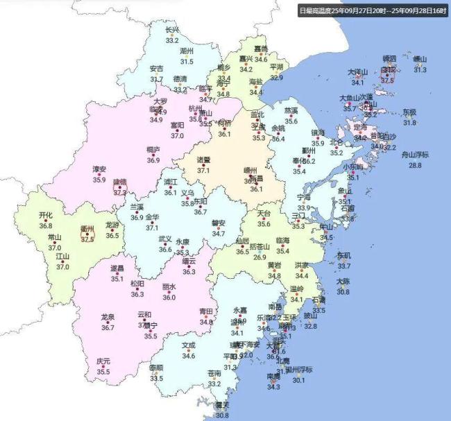 昨天,副热带高压依然强劲,午后高温范围进一步扩大。杭州气温达到35.8℃,创下今年第65个高温日,刷新了全年高温日数的纪录。岱山气温为35.2℃,打破了当地9月下旬最高气温和最晚高温日的记录。截至昨天16时,高温前三名分别是衢州37.5℃、建德37.3℃以及金华、诸暨、云和均为37.1℃。午后全省大部分地区多云到阴天,杭州、绍兴等地出现了短时强降雨。今明两天,全省天气以多云为主,午后可能有雷阵雨。