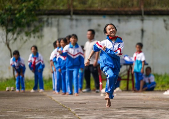 2025年9月15日,云南省普洱市孟连傣族拉祜族佤族自治县腊福小学学生课间在操场进行奔跑接力比赛。新华社记者 陈欣波 摄