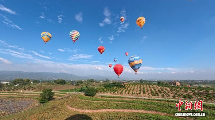 图为五彩斑斓的热气球缓缓升空,漂浮在金堂县万亩橘园上。杨予頔 摄