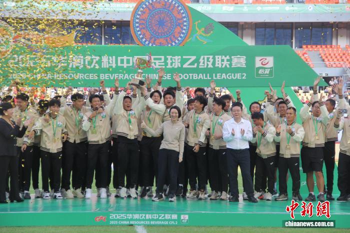 中新网南宁10月27日电 (黄令妍)10月26日,2025中国足球乙级联赛第30轮比赛在广西体育中心举行。主场作战的广西恒宸以1比2不敌无锡吴钩,但其已提前三轮锁定赛季冠军,以总积分73的战绩,在赛后颁奖典礼上捧起奖杯。