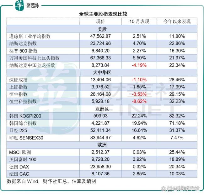 股市方面,美股三大指数全线上涨并创新高。纳斯达克指数单月涨幅4.70%,标普500指数涨2.27%,道琼斯工业指数上涨2.51%。大型科技股是支撑市场持续走强的主要力量,万得美国科技七巨头指数10月份涨幅达5.50%。中概股和港股则陷入深度回调,纳斯达克中国金龙指数下跌4.19%,恒生指数跌3.53%,恒生科技指数跌幅扩大至8.62%。A股表现平淡,上证指数上涨1.85%,深证成指跌1.10%。