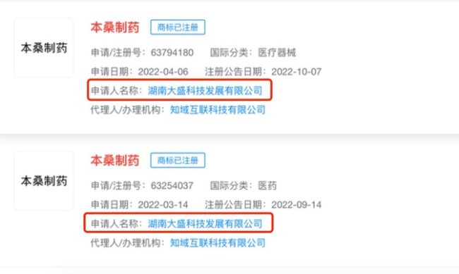 但中华网财经注意到,其国内商标注册主体实为"湖南大盛科技发展有限公司",自2022年3月开始申请注册本桑制药相关商标,不过截至发稿,该公司已于近日更名“湖南拓域广厦建筑工程有限公司”。