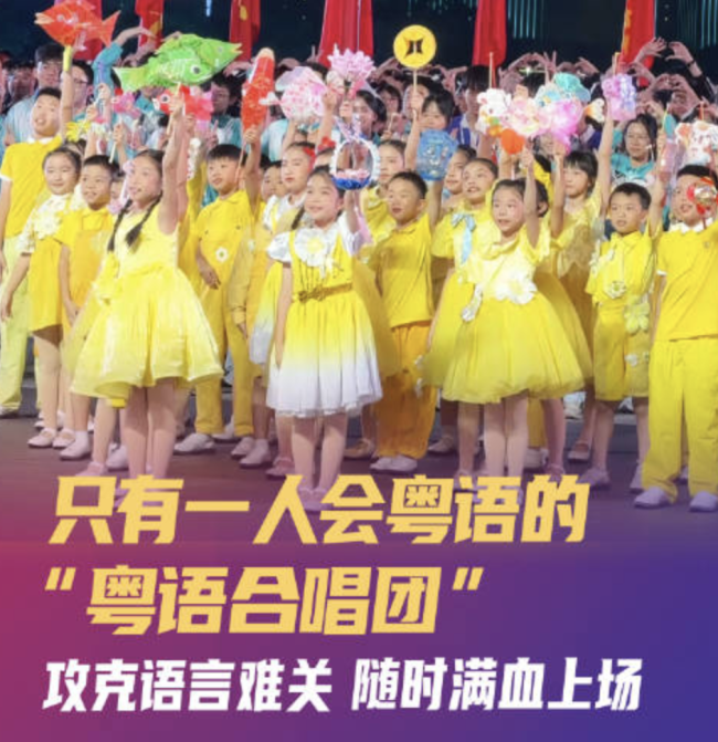 39人粤语合唱团竟只有1人会粤语,演唱粤语儿歌的合唱团,居然只有一人会粤语?10后苦练粤语只为全运会闭幕式献唱,深圳蛇口学校五彩石合唱团的小团员们刻苦练习,攻克语言难关,将在十五运会闭幕式上奉献精彩的粤语表演。