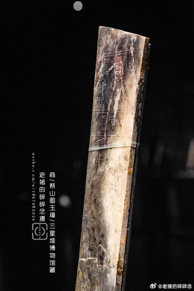 我说当时在三星堆拍摄这件玉璋的时候,上面有明显的拼接修补的痕迹呢,原来是这么回事。这件玉璋之所以珍贵,是因为上面有一幅中国最早的玉器线刻画《祭山图》。这意味着蜀地或为中国绘画的源头。为研究古蜀宗教祭祀礼仪提供了珍贵的资料。图案内容生动刻画了古蜀国原始宗教祭祀场面,反映祭祀神山及神山上神灵,是祭山场面,但又具有图画和纪实的两种原始功能,所以,又可视为罕见的古蜀国巫觋祀山的绘画艺术和图案艺术的有力例证。