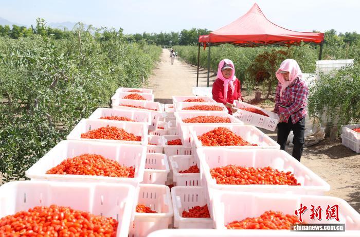 每年6月,头茬枸杞迎来丰收,农户穿梭在银川一处枸杞园里采摘鲜果。(资料图) 中新网记者 于晶 摄