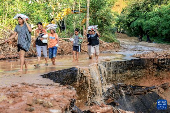 12月2日,在印度尼西亚北苏门答腊省北打巴努里,当地居民搬运救援物资。新华社发(阿尔贝特·达马尼克摄)