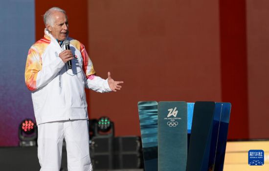 12月6日,米兰冬奥会组委会主席乔瓦尼·马拉戈在火炬传递前致辞。新华社记者 李京 摄