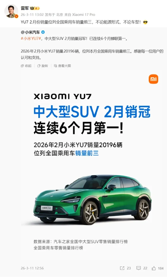 小米创办人、董事长兼CEO雷军在微博宣布,小米YU7汽车2月份销量位列全国乘用车销量前三,无论能源形式和车型。小米汽车官方微博也表示,小米YU7中大型SUV在2月销量夺冠,已连续6个月蝉联第一。2026年2月,小米YU7销量达到20196辆,进入全国乘用车销量前三。