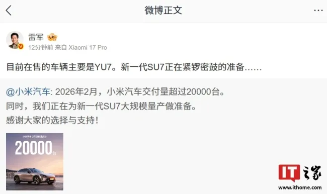 根据官方消息,2026年2月,小米汽车交付量超过20000台。雷军提到,目前主要销售的车辆是YU7,并且小米汽车正在为新一代SU7的大规模量产做准备。