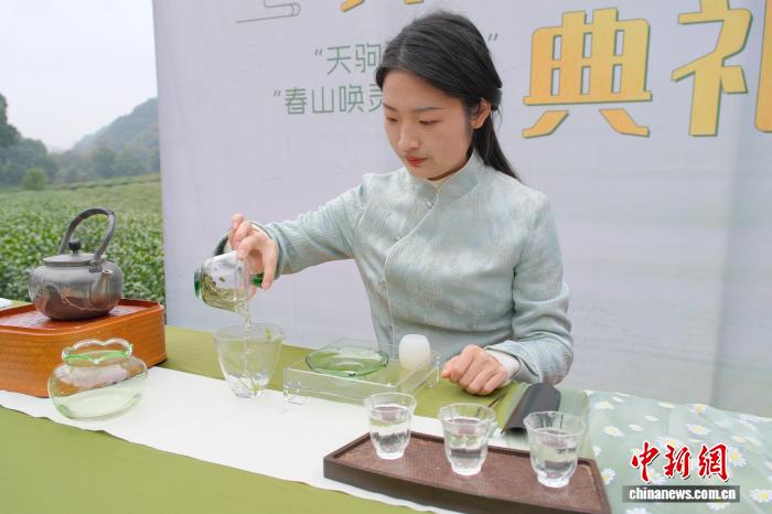 3月19日,茶艺师展示西湖龙井冲泡技艺。当日,西湖龙井茶开茶典礼在浙江杭州西湖龙井核心产区梅家坞举行,宣告春茶正式开采。中新社记者 曹丹 摄