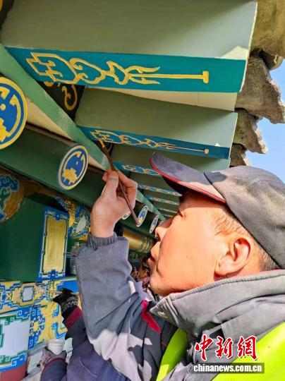 图为工匠正在进行古建彩绘作业。田兵 摄
