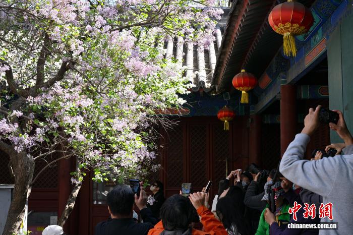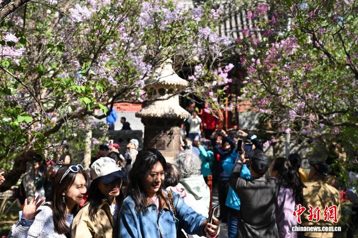 4月1日,游客在法源寺绽放的丁香花下合影留念。中新社记者 田雨昊 摄