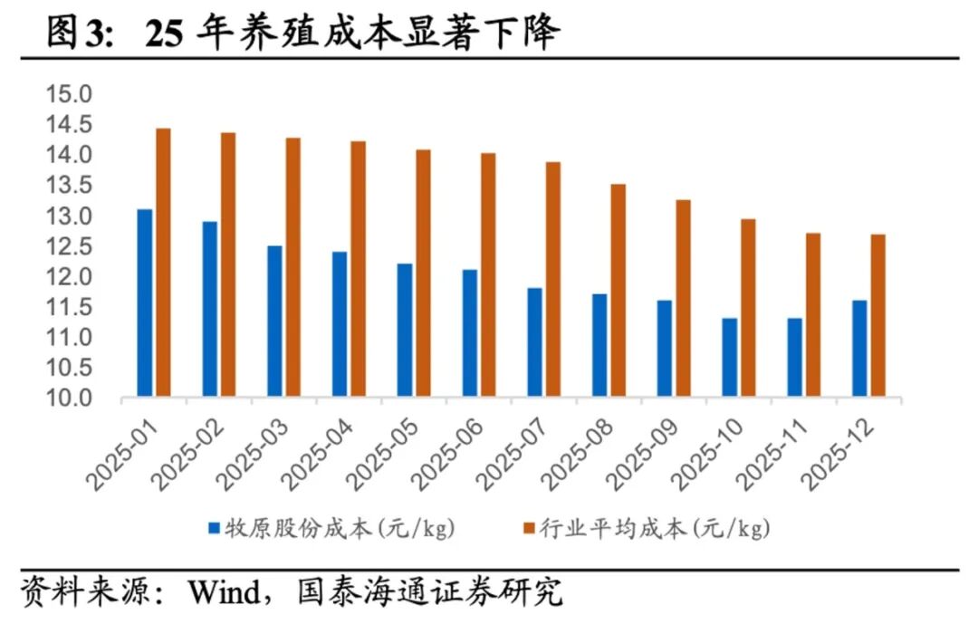 财报显示,牧原股份2025年全年生猪养殖完全成本约12元/公斤,较上年同期降低约2元/公斤。