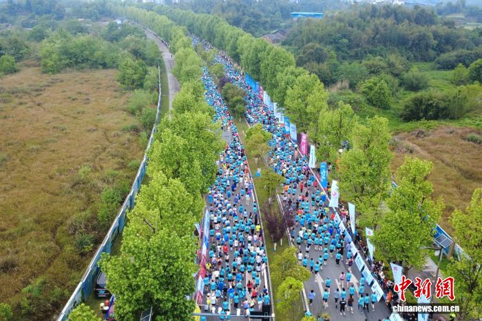 图为选手在赛道上奔跑。(无人机照片)中新社记者 肖江川 摄