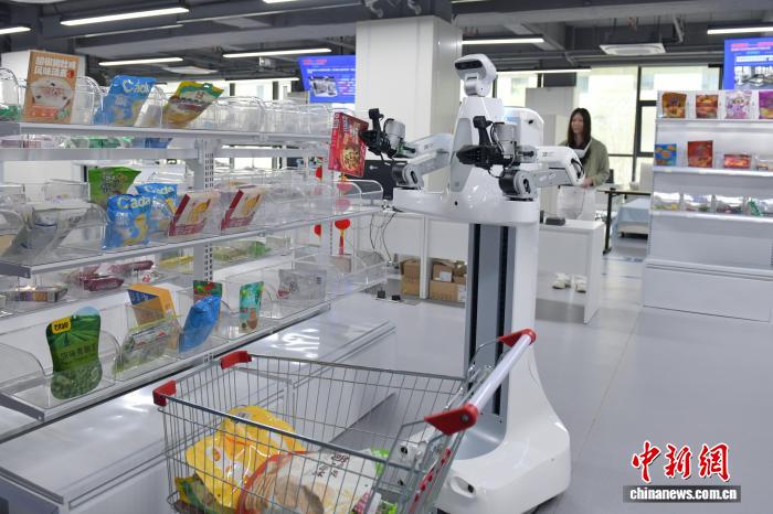 4月13日,在安徽省合肥市具身智能机器人训练场,机器人数据采集员在训练机器人拿取货架物品。中新社记者 储玮玮 摄