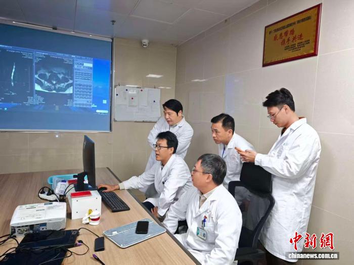 2025年12月,来自越南的韦洪德医生(后排中)在南溪山医院脊柱外科参加病例讨论学习。(资料图)广西壮族自治区南溪山医院供图