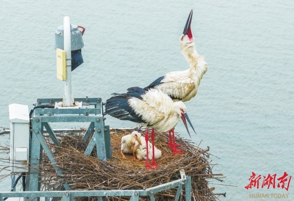 春日的洞庭湖生机勃勃。在湖南东洞庭湖国家级自然保护区岳阳县春风湖外滩,一座20余米高的监控铁塔顶端,一个直径近两米的鸟巢中,东方白鹳正在繁育后代。