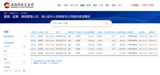 2024年四季度以来,公司高管及股东存在多轮减持行为。期间,核心技术人员Marco Zanor累计减持67.67万股,上海鼎晖源霖股权投资合伙企业累计减持超过3000万股,安徽信惟基石产业升级基金合伙企业(有限合伙)减持超过1000万股。
