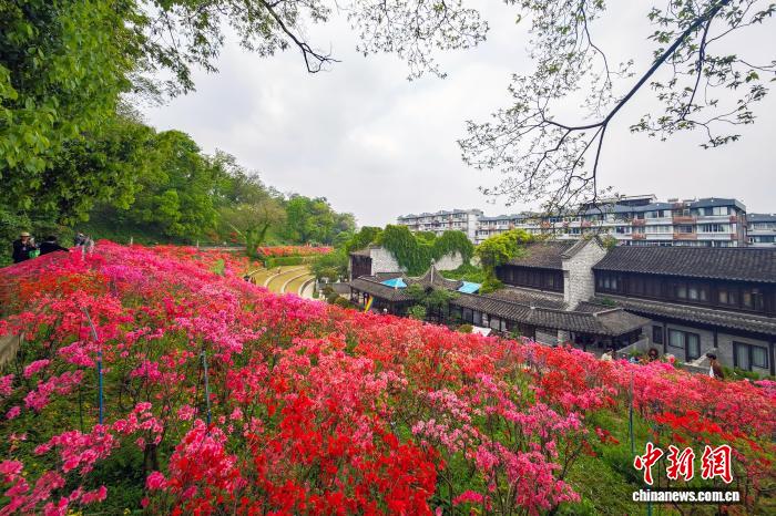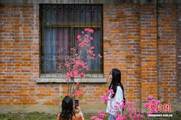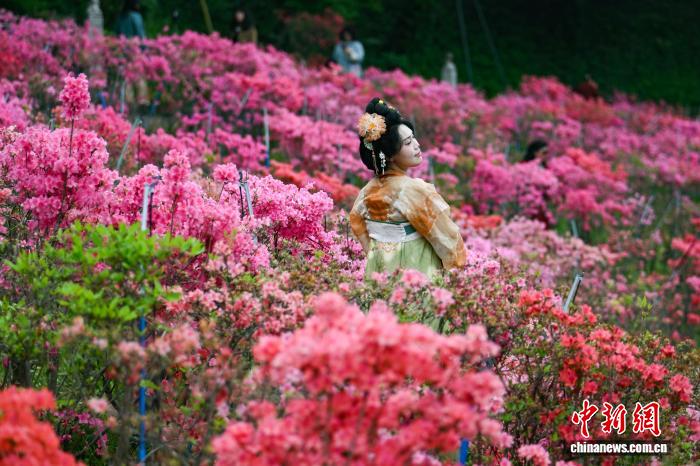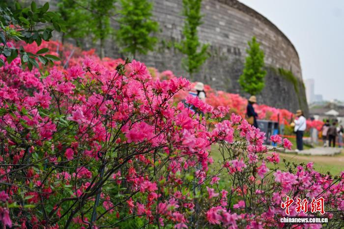 4月17日,江苏南京,明城墙下杜鹃花进入盛花期,红色、粉色的花朵层层叠叠,与古朴的城墙、建筑相互映衬,让人流连忘返。中新社记者 泱波 摄